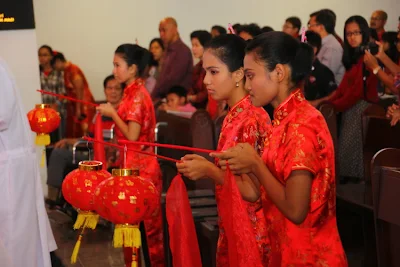 lagu-lagu – seragam berkebudayaan Tiongkok menghiasi sepanjang misa ini.